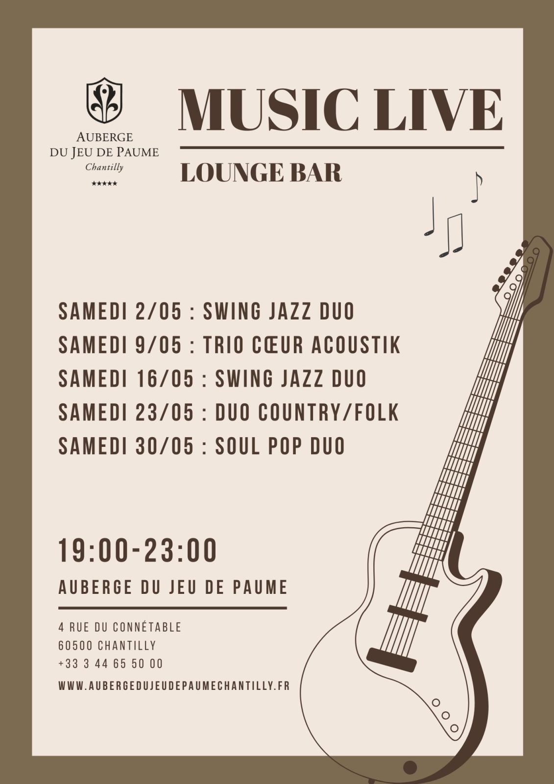 Selon différentes formations (duo guitare/voix, trio jazzy ou jazz manouche), savourez un afterwork, une soirée à deux ou un verre entre amis dans une ambiance feutrée, raffinée et décontractée à la fois !